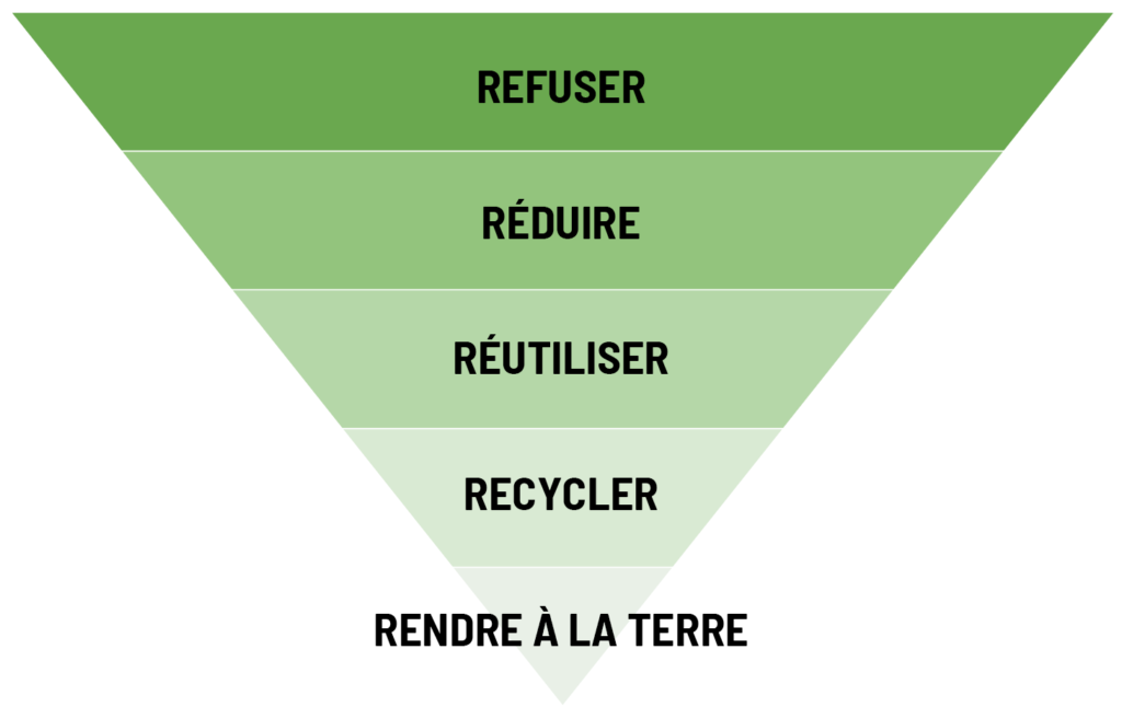 La pyramide du Zéro Déchet ou les 5R est un moyen mnémotechnique permettant de questionner ses pratiques quotidiennes pour réduire ses déchets à la source. Mais attention, le zéro déchet n’est pas une injonction, il s’agit d’un objectif.